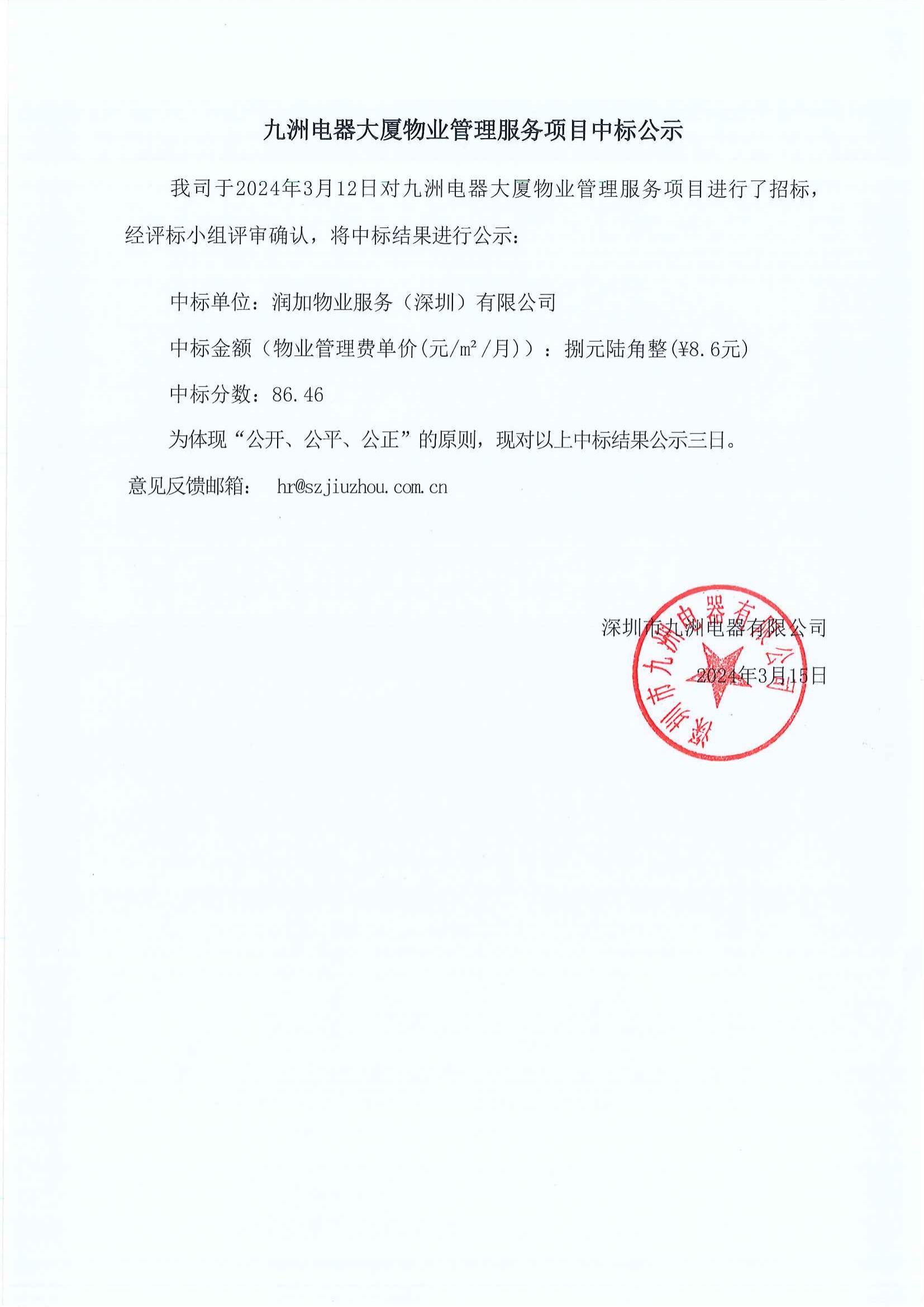 九洲電器大廈物業(yè)管理服務項目中標公示