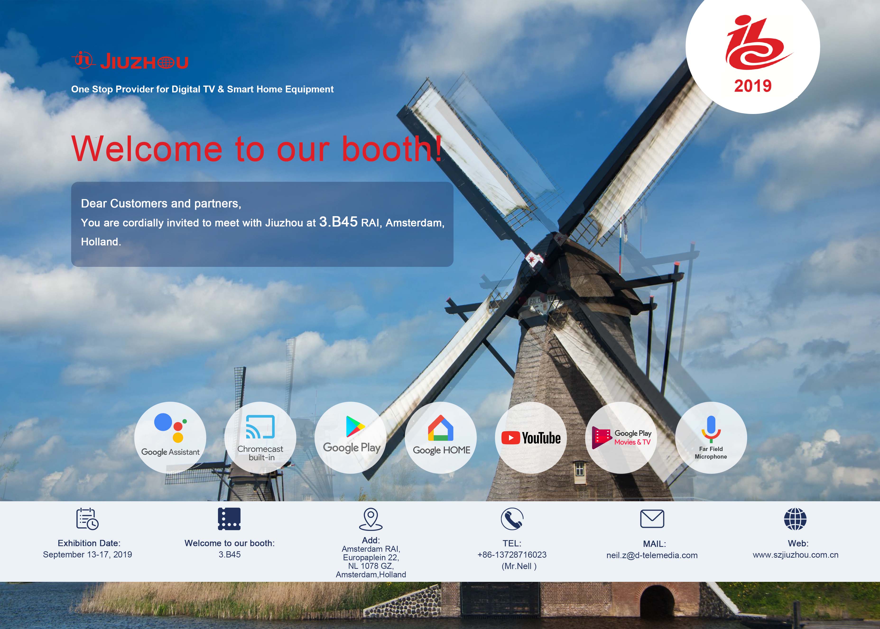 2019年荷蘭廣播電視設備展覽會(IBC),將于2019年9月13-17日在荷蘭阿姆斯特丹國際展覽中心舉行。深圳九洲電器將攜數(shù)字電視與智能家居產(chǎn)品亮相荷蘭IBC展會。